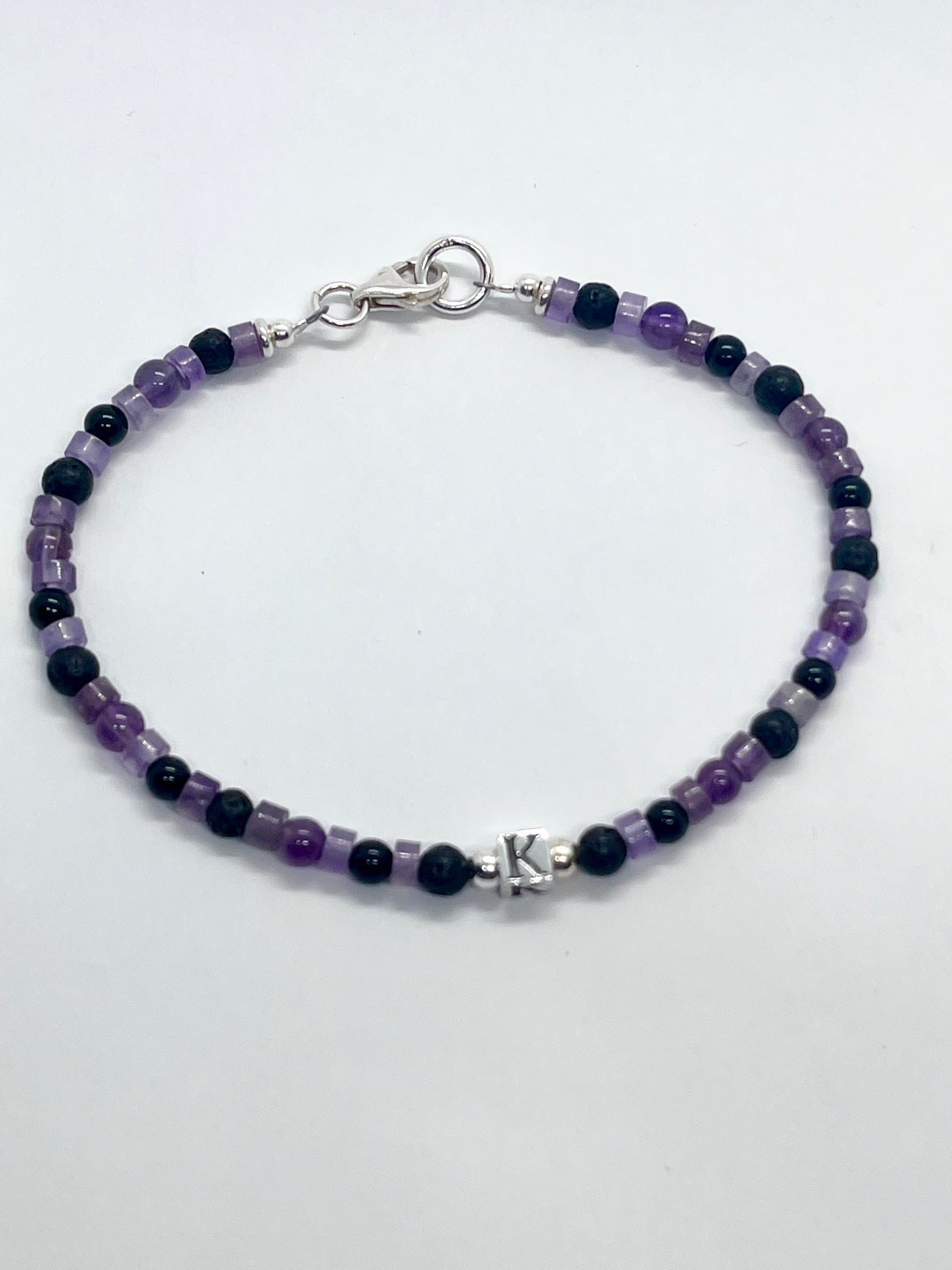 'Amethyst Cube Charm’ unisex genuine Amethyst, Black Onyx, Lava bead & 925 sterling silver personalised cube letter bracelet