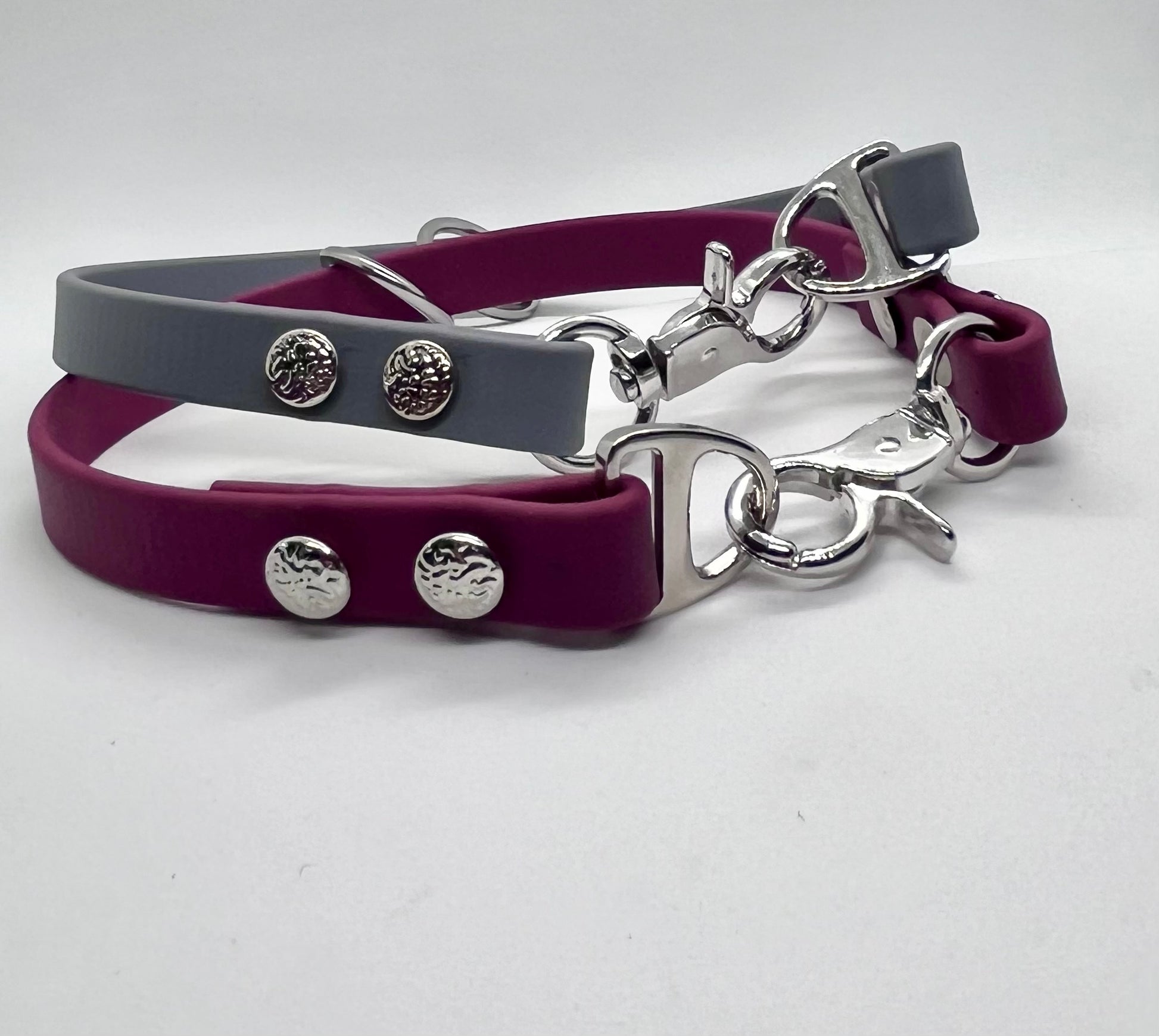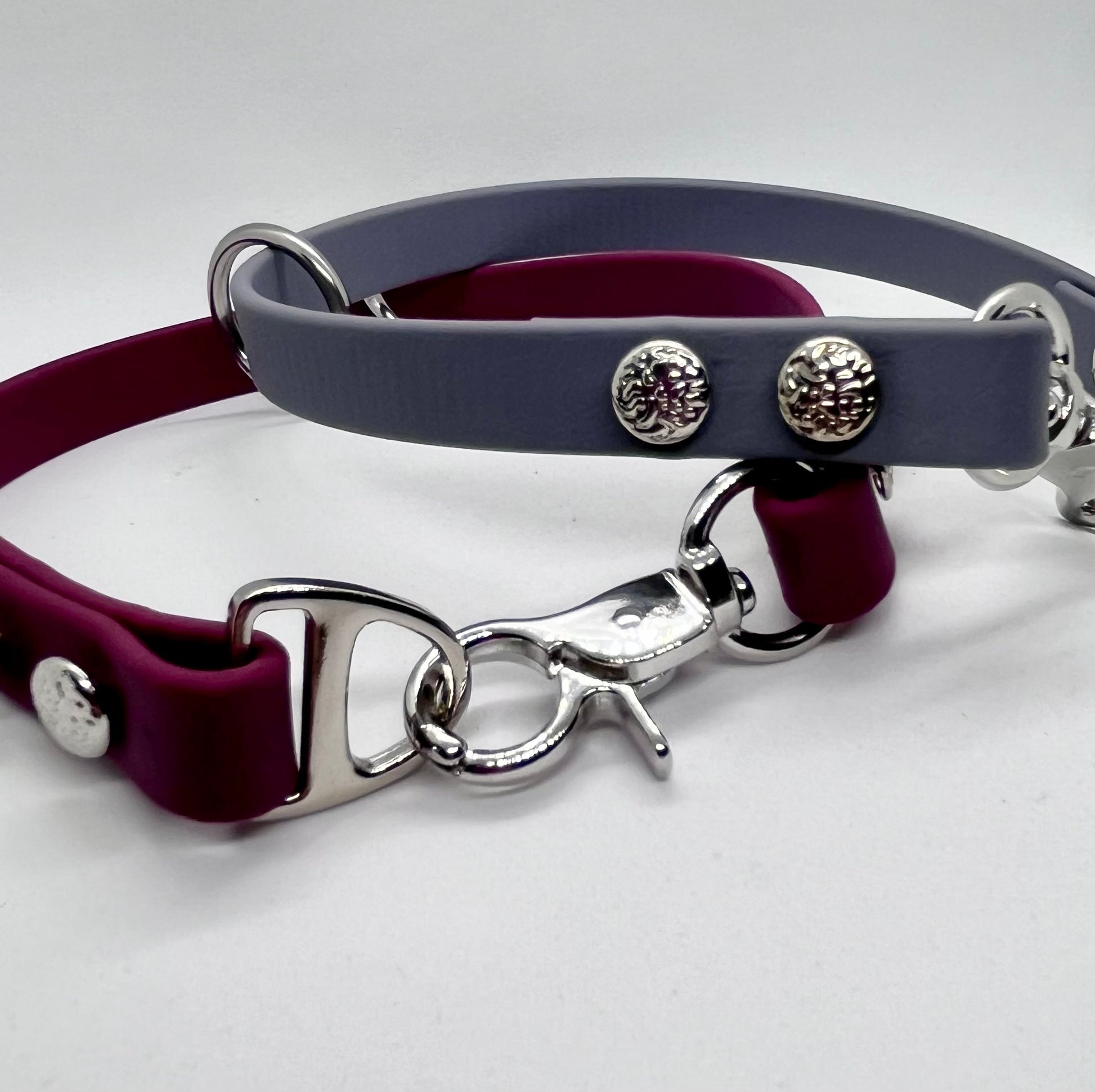 13mm BioThane®, textured steel studs. D ring clip steel fastener stainless steel lead clip & floating O ring. Optional 12 inches/1 ft lead extender steel studs.